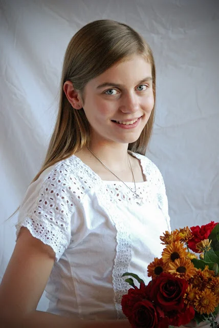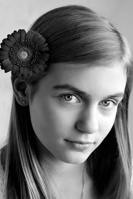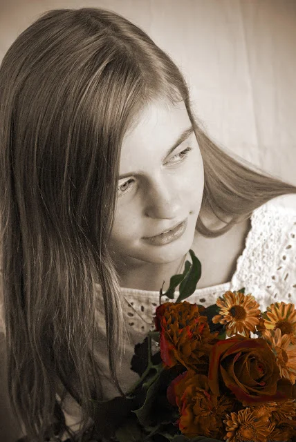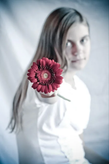 We did a photo shoot on her birthday, and just for fun, we shot it like we did when she was a toddler. We used flowers for props, and dressed her in white so that we would have a high-key portrait that could be colorized, or converted to black and white. We had a fun time!