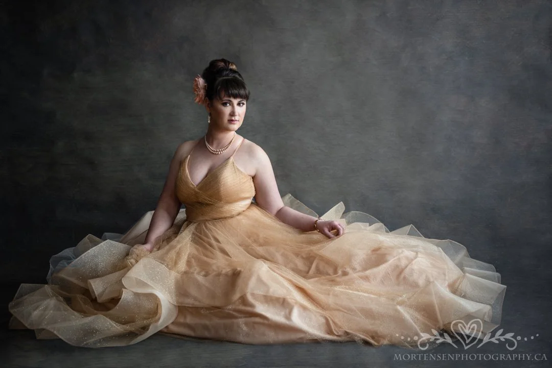 For her opera side she wanted a Madame Butterfly themed look, so we had a lot of fun creating some images for here with butterflies, and flowers. Alicia also brought in a fabulous gold gown which made for some gorgeous and dramatic images!! If you follow me on Instagram check out my “behind the scenes” story to see a clip of Alicia treating us to some singing! She’s amazing!! She also teaches singing at Alicia's Vocal Studio, Airdrie, AB