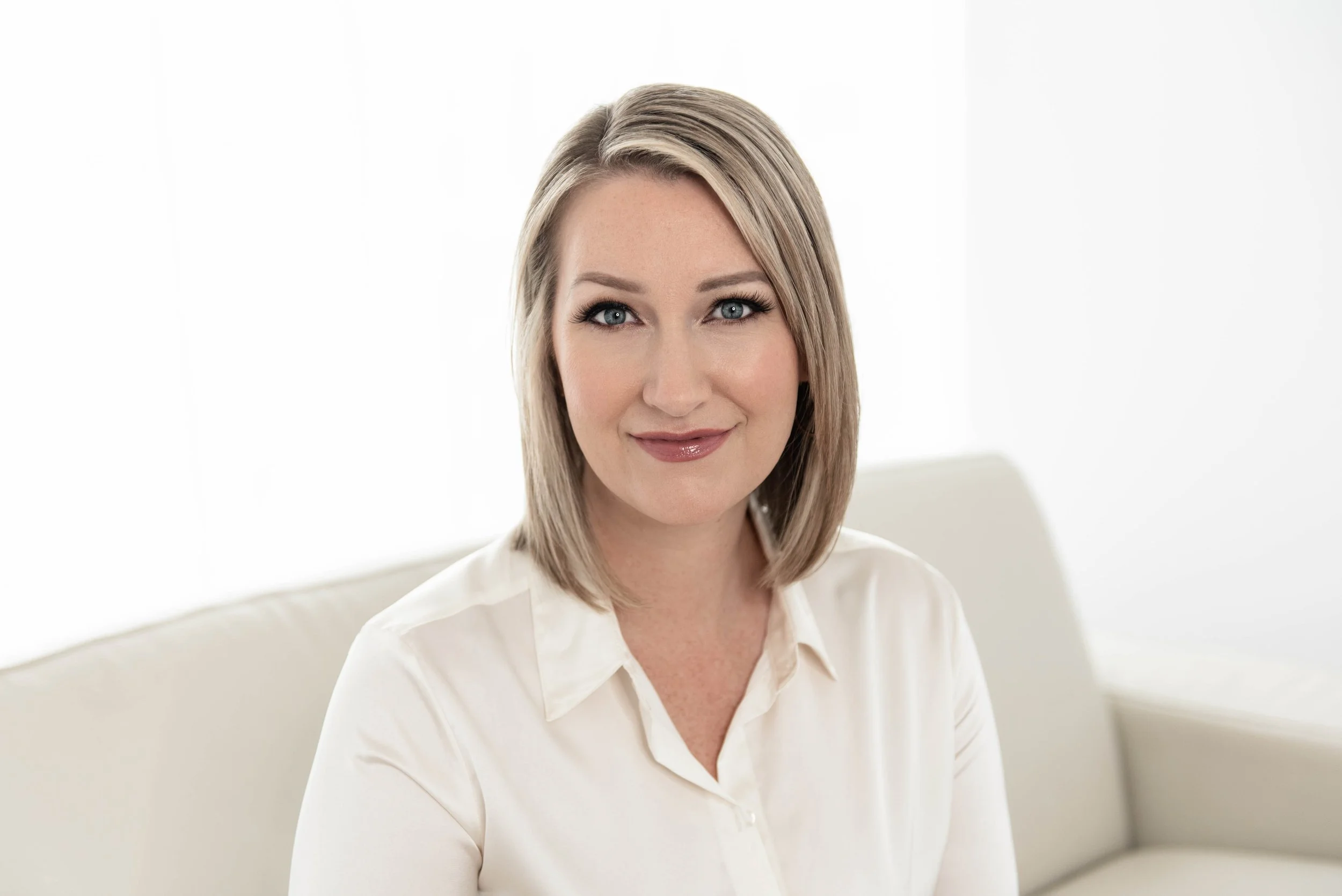 From there, we moved into a bright, white, backlit setup for a totally opposite look. Using my white leather couch, we captured clean, light-filled headshots, then switched to a casual outfit with jeans and a white t-shirt for fresh, relaxed images that feel modern and effortless.